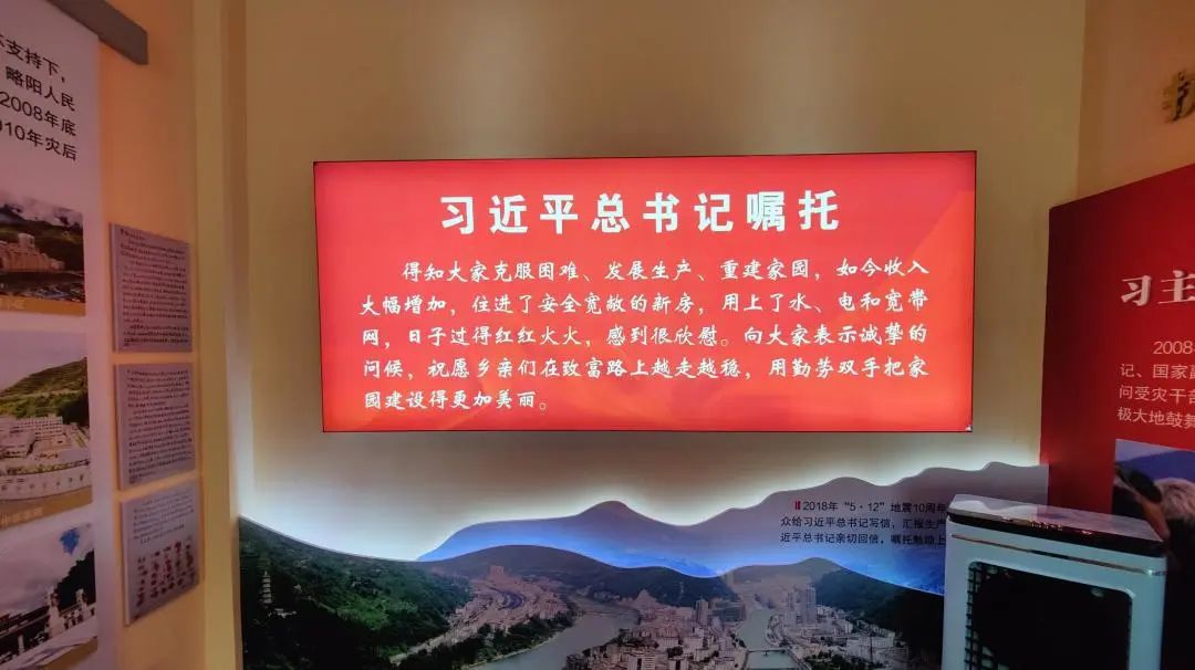 在明理馆的正厅,映入眼帘的便是悬挂着习近平总书记在512地震”十周年之际对汉中人民的亲切关怀嘱托。红色闪耀的背景下,一张张弥足珍贵的照片、一件件布满历史斑驳的物品,都彰显着徐家坪灾后重建、脱贫攻坚、乡村振兴发展历程等情况。